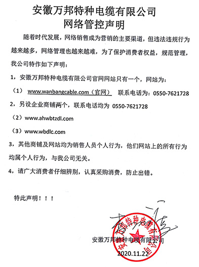 鄭重聲明:安徽萬邦特種電纜有限公司官方網站為:www_wanbangcable_com.simsimyi.cn,除此之外無任何子網站或合作網站,其余均為假冒偽劣。電話:0550-7621728 13485756353 地 址:安徽省天長市滁州高新技術產業開發區經四路29號